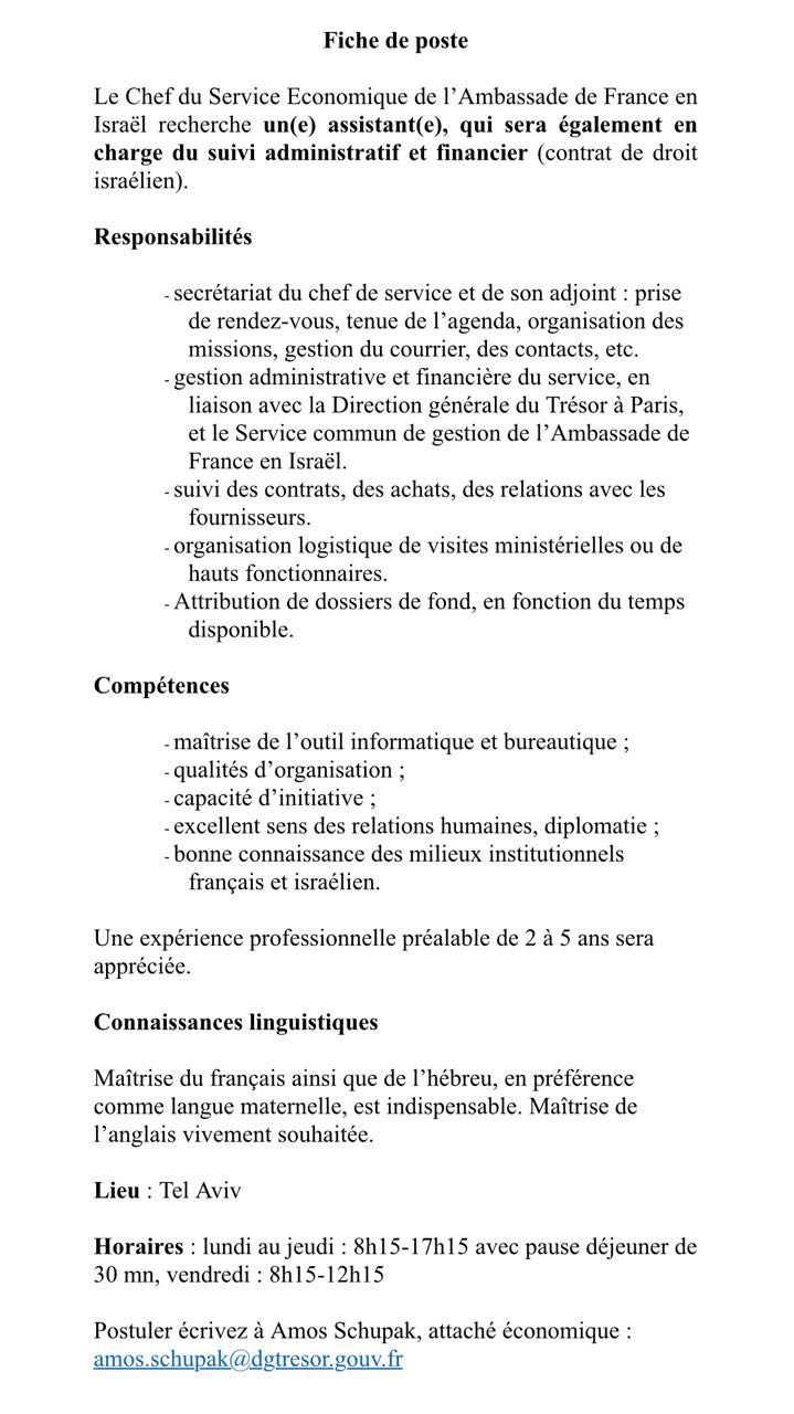 מייל שהגיע לידי עם המידע הבא: למשלחת משרד הביטחון בשגרירות ישראל בוושינגטון דרוש\ה לתפקיד עמ”י בטווח זמן מיידי. מחפש בחור/ה אחראי/ת ואיכותי/ת לתפקיד של עמ״י (עובד מקומי ישראלי) בוושינגטון. תחילת תפקיד – בקיץ הקרוב. התפקיד הינו לשנתיים-שלוש. התפקיד מעניין ומאתגר ומיועד לבוגרי תואר ראשון ביחב״ל, ממשל, דיפלומטיה, לימודי בטחון וכד׳. עדיפות לבעלי/ות סיווג בטחוני. ניתן לשלוח מייל עם קו״ח ל:Mod@israelemb.org