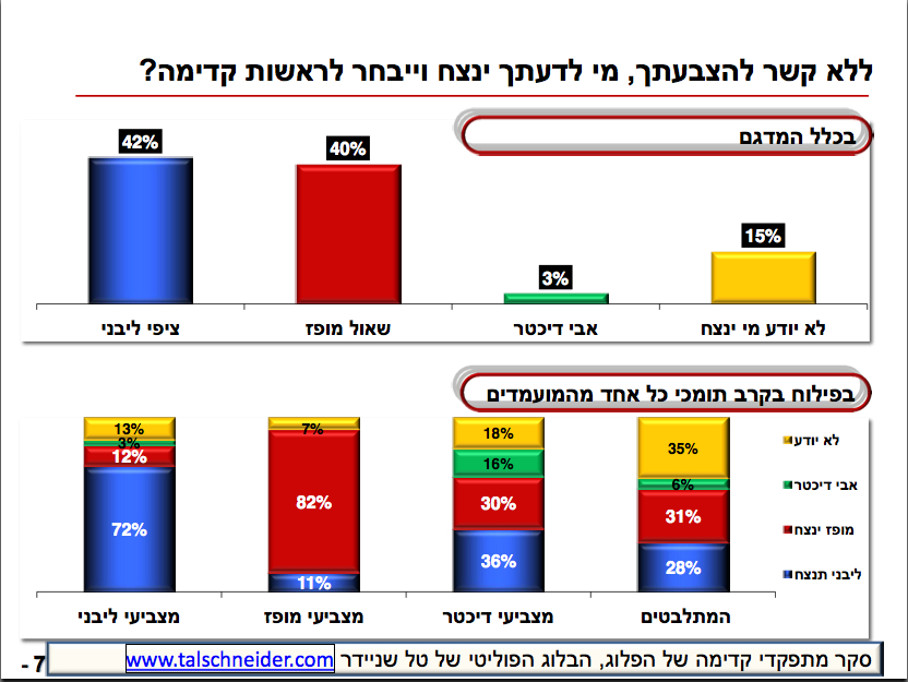 מתוך אלה שהשיבו כי הם בטוחים שיבואו להצביע זוכה לבני לשיעור תמיכה של 51% לעומת 38% שיעורי תמיכה למופז. מתוך אלה שהשיבו כי הם בטוחים שיבואו להצביע שיעור התמיכה בדיכטר צונח ל 3%. זוהי תופעה מוכרת, כאשר מדובר במועמד שסיכוייו פחותים.