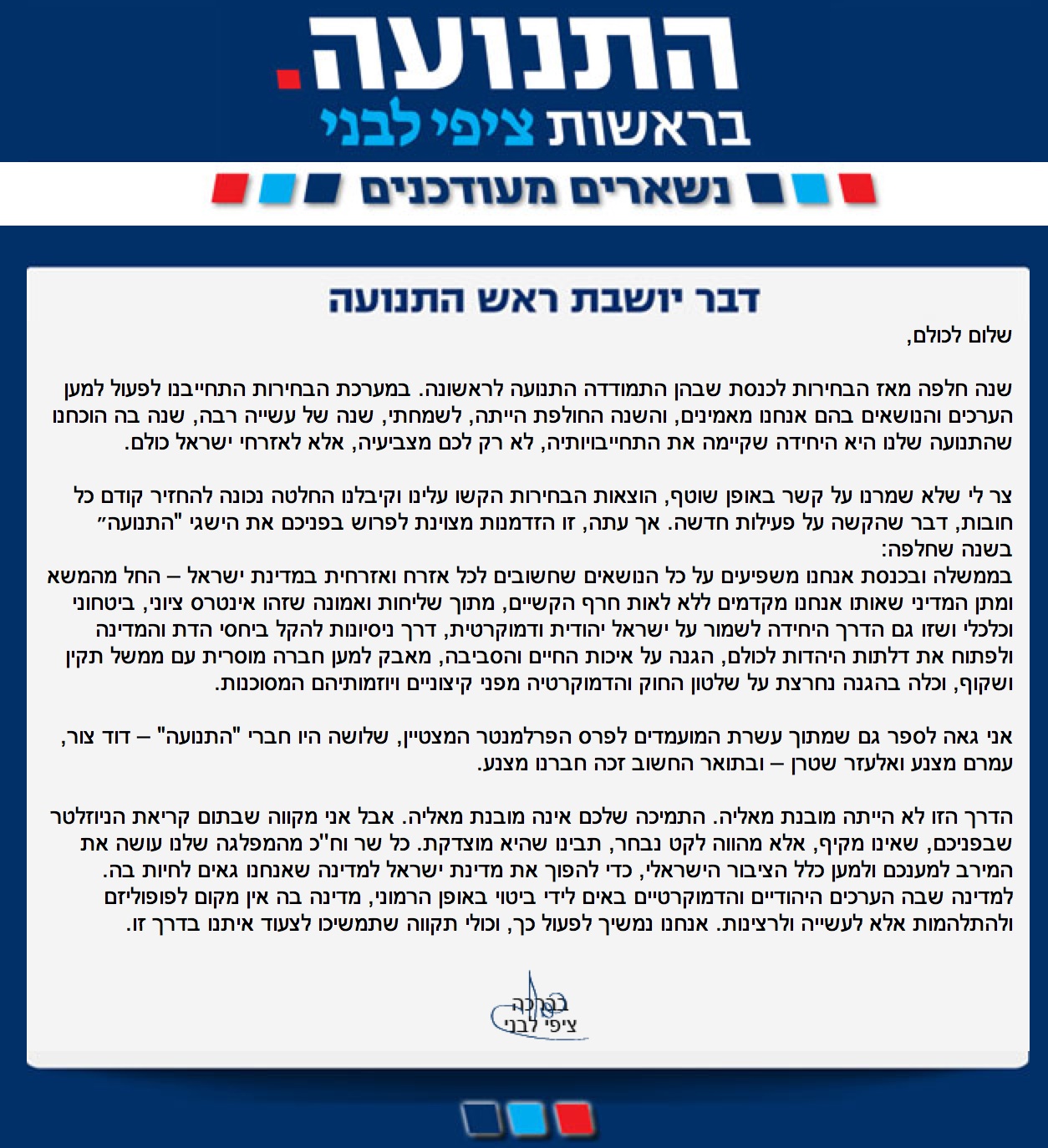 שנה אחרי הבחירות ובמפלגת התנועה בראשות ציפי לבני התחילו בפעם הראשונה להתייחס לציבור התומכים שלהם. לפני כמה ימים העלתה יו”ר התנועה, השרה ציפי לבני לינק בעמוד הפייסבוק שלה ובו קראה לתומכיה ותומכי מפלגתה להירשם לניוזלטר. למי מכם שלא רוצה להירשם כדי לקרוא את התוכן, הנה חלקו הראשון של הניוזלטר.