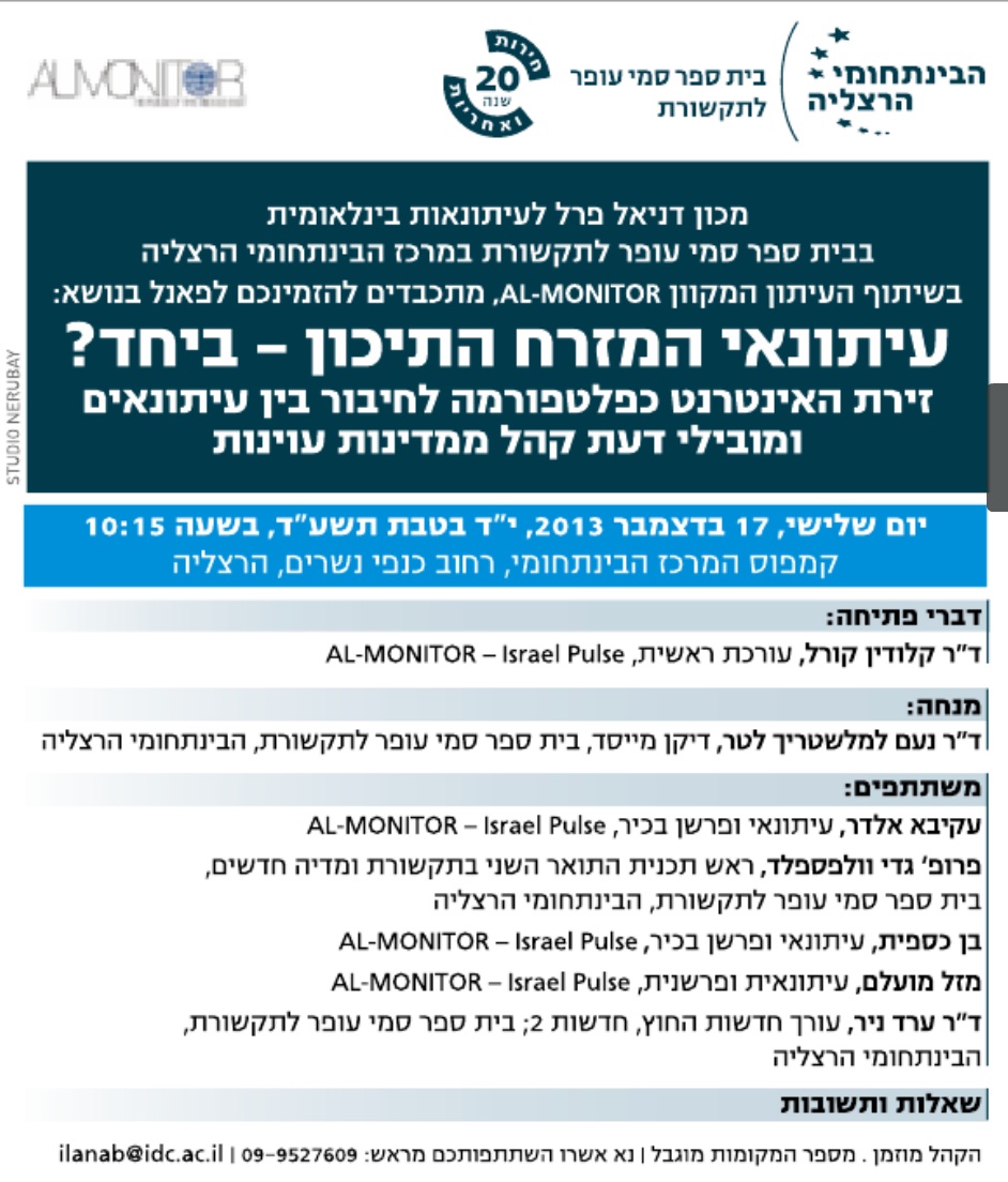 דיון מעניין במרכז הבינתחומי בהרצליה: זירת האינטרנט כפלטפורמה לחיבור בין עיתונאים ומובלי דעת קהל, בהשתתפות אנשי אל-מוניטור (בעיקר) ומומחי תקשורת.